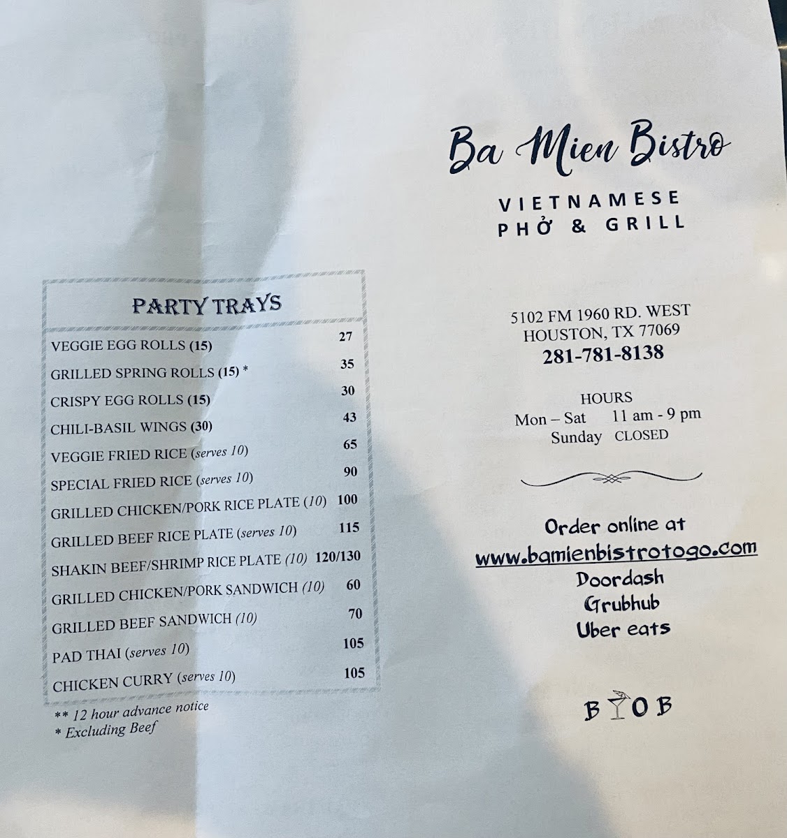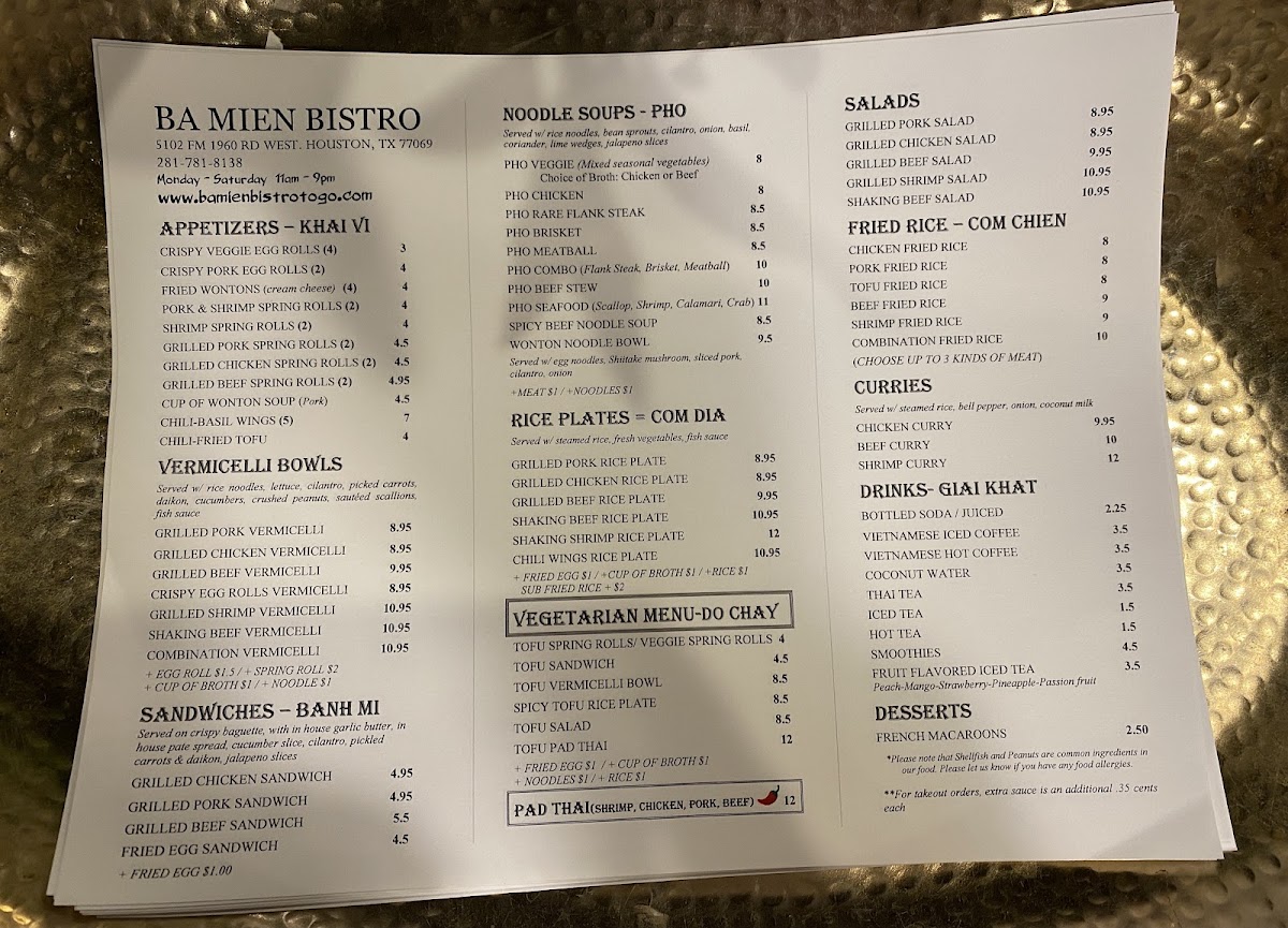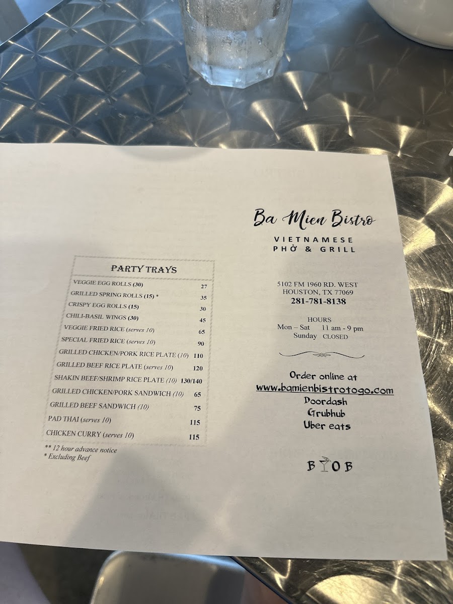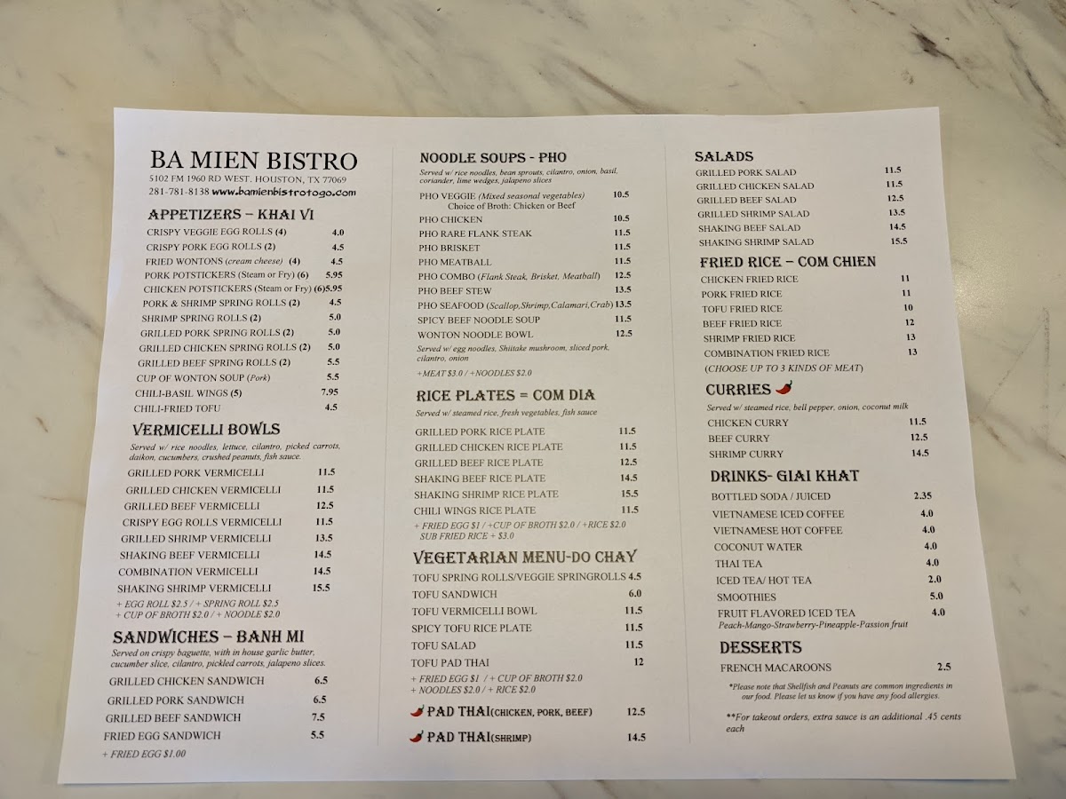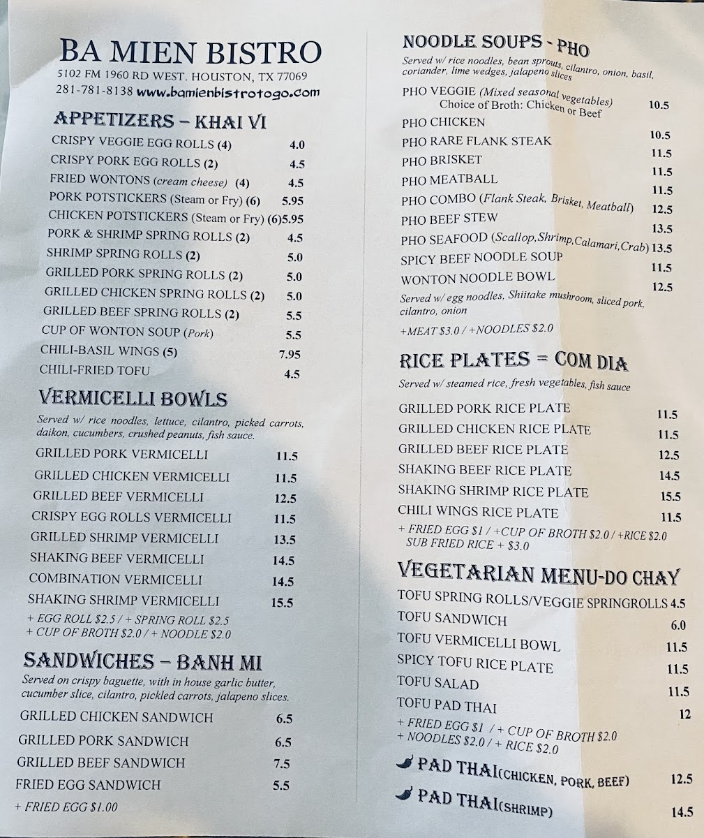 Welcome to Ba Mien Bistro, located in Houston, TX, where fresh meets flavor in a charming setting. This self-service Vietnamese bistro stands out with its high-quality dishes, each thoughtfully crafted to delight your taste buds. Guests rave about the Spring Salad with Pork, a refreshing choice on a warm day, as well as the delectable Beef Luc Lac, known for its tender, juicy cuts.